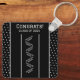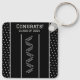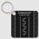 Here is a great way to celebrate your graduate. Custom black and white keychain features the text, "Congrats! Class of 2025." It has a classic black background with an inspirational Adventure Awaits and arrow pattern. Use the template to personalize.