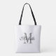 Black and white custom monogram reversible Tote Bag. Elegant shoulder bag for shopping, groceries, office, books, sports, wedding and more. Classy black and white typography design template. Double sided print with black handles. Classy Birthday gift ideas for women and girls.
