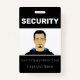 This custom photo identification badge features a sample photograph in the centre. The title "SECURITY" is printed above it in bold white font over a black background. You can include your company name or addition text below the image, as well as an employee name. The back of the badge features additional employee or company information printed over a black background, with a sample barcode placed at the bottom. You can replace the scan code with your own, or another image, such as a custom logo.