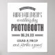 8 x 10" size custom wedding photo booth sign poster print can be personalized with bride and groom names and wedding date text. Sign reads "Welcome to Bride and Groom's wedding day photobooth, wedding date (xx.xx.xx), Grab a prop and strike a pose!". Black, charcoal grey and white colours.