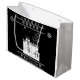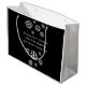 This cute snowman gift bag is customizable for you to add your own message The short christmas verse on the back of the bag is also customizable. The smiling snowman is wearing his favourite black hat and back and white striped scarf, he's looking down at his christmas stocking that's hanging on a tree branch waiting for santa to fill it with special gifts. In the background the stars are shining and the trees are covered in snow. This original seasonal gift bag makes a great festive presentation for most gifts. The original snowman illustration is a pen and ink drawing, he makes a cool trendy black and white gift bag.