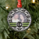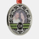 Black and white damask wedding photo ornament featuring your precious photo framed in black and white damask pattern black and green bands and your initials in a circle.