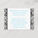 This black and white damask Reception Enclosure card has an aqua blue PRINTED ribbon that would be perfect for an aqua and black themed wedding. Some of the papers will alter the colour of the design, so use caution if you choose one of the paper types besides the basic white shown here. ALSO, if you re-size the card, or if you change fonts, or the size of the font, some of the design and/or text may get cut-off. Everything will print as you see it on your monitor. I will not see your card, and Zazzle will NOT correct anything (typos, mis-alignment etc.). The text and paper is all customizable. If you need help with this card, please email me BEFORE you place your order. If you require any other matching items, please email your request to niteowlstudio@gmail.com