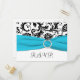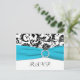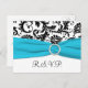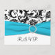 This black and white damask RSVP card has an aqua blue PRINTED ribbon and PRINTED diamond jewel brooch that would be perfect for an aqua and black themed wedding. Some of the papers will alter the colour of the design, so use caution if you choose the felt paper, as it may yellow the look more than you want. I would NOT use the gold or silver metallic papers, as they will darken the design without adding any extra sparkle to it than what you would get with the metallic ice or champagne papers. ALSO, if you re-size the card, or if you change fonts, or the size of the font, some of the design and/or text may get cut-off. Everything will print as you see it on your monitor. I will not see your invitation, and Zazzle will NOT correct anything (typos, mis-alignment etc.). The text and paper is all customizable. ****PLEASE NOTE that the small RSVP card (3.5”x5.0”) is the ONLY card that will fit in the envelope for the 5.25” square invitation, if applicable. If you need help with this invitation, please email me BEFORE you place your order. If you require any other matching items, please email your request to niteowlstudio@gmail.com.