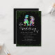 Make your wedding unforgettable with this unique black and white elegant dinosaur wedding invitation featuring a charming psychedelic multicolored T-Rex bride and groom illustration in pink, blue, orange, green, yellow, orange, purple and teal. Perfect for couples who share a love of dinosaurs, this fun funky yet elegant wedding invite blends playful Jurassic personality with modern botanical style.