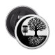 Disc golf themed bottle openers. Black and white disc golf basket and tree roots silhouette.