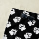 Fun black and white design split with a fun wave shape. On the bottom there is a white dog paw print that has a black personalizable monogram on it. On the top there is a pattern of white dog paw prints on a blue background colour.
