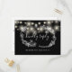 A black and white RSVP card featuring pretty string lights, hand-drawn floral garland and chic typography. The reverse features your details and a fun guest song request. Designed by Thisisnotme©