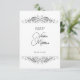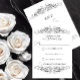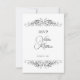 © 2023 Socialite Designs Inc. Elegant event response card has beautiful black flourish design on a white background. Pair this elegant RSVP card with the matching wedding invitation and other products from this design collection.