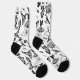 These fun and spooky Halloween socks, hand-drawn Halloween illustrations in black ink, feature an assortment of Halloween-themed drawings, including a pumpkin, witch's hat, a broom, a bubbling cauldron, an enigmatic black cat, an ancient spell book, spiders and their intricate webs, an old spooky oak tree, a vintage bird cage, a raven, and gothic flowers.