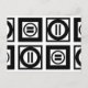 Bold geometric pattern features four black squares with white space between them. The two diagonally opposed thick squares each contain a thin black circle with a thick equal sign inside. In contrast, the two thin squares each contain a thick black circle that touches the square’s edges with a thin vertical equal sign inside.