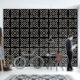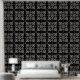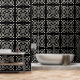 A stylish modern black and white geometric fleur du lys shapes and quatrefoil shaped peel and stick wallpaper wall treatment, to modernize your bath, kitchen, or any room. Perfect when you live in a rental apartment that needs your personal style and touches of design to make things pop. Peel and stick wallpaper is one of the best DIY hacks for apartment dwellers to give them more control over their home decor style! Go wild with patterns and colours. Comes in smooth and textured. Get the textured for bumpy textured walls, and smooth or textured for smooth walls.