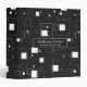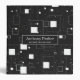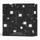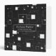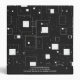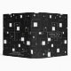 This image features a modern, abstract geometric pattern in black and white. It consists of various-sized squares and rectangles arranged randomly across a black background. Some shapes are solid white, while others are outlined, creating a layered effect. Small dots and pixel-like elements are scattered throughout, adding depth and texture. The overall design is minimalistic and conveys a digital or futuristic aesthetic.