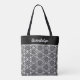 Add timeless elegance to your outfits with this striking black and white pattern design. This bag has a detailed, symmetrical layout, borrowing inspiration from classic Middle Eastern and Moorish motifs, giving this minimalist geometric print a bold yet refined look. The high-contrast monochrome palette gives it a modern edge while it is really timeless.