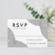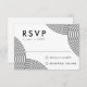 Modern wedding response cards featuring black swirled geometric lines at the corners with a white background. Personalize the black and white wedding RSVP cards by adding your RSVP date and custom accepts/declines wording. The modern boho RSVP cards reverse to display a solid white background.