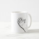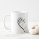 The mug shows a moment in time with a hand sketched in black and white on two sides of the mug. This hand can portray a thankful spirit and a kindred spirit alike making it the perfect gift for a friend. The palm of this hand is extended showing vulnerability and an invitation to continued friendship .