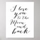 Typography black I love you to the Moon and back poster sign print printed on white background. Dimensions of the sign print (poster) are 8.5 inches by 11 inches. You can also add standard black wood frame or custom wood or metal frame available in 42 different colours.