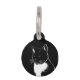 Black and white illustrated Cat Pet tag. Hand-drawn black and white outline of a playful cat sitting gracefully. The cat's is looking out and it captures its curious nature.
