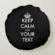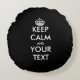 Cute black and white keep calm and your text round throw pillow. Personalizable template for making your own funny keep calm and carry on parody. Vintage keepcalm typography with little crown. Create your own keepcalmandcarryon spoof. Funny home decor for sofa couch or bed. Customize dark colour / colour. Double sided design.