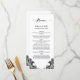 An elegant black and white lace wedding menu.
