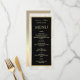Elegant, modern, simple minimalist black and white marble wedding menu with modern gold script and metallic gold foil back side.