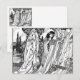 decorative vintage black and white drawing of ladies of the middle ages in beautiful long gowns and cloaks with decorative patterns with flowers, long hair in plaits socialising together in a garden with cypress trees and flower bushes as one lady with long hair and long flowing dress carries a bunch of garden roses in her hand, a fine art drawing for lovers of classical style art with a group of girls of medieval times