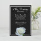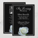 A beautiful funeral or memorial service announcement with a template photo for the deceased person and a quote printed on back of invitation. Adorned with with a white rose, symbol of love, over a black background.