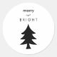 These simple, modern holiday stickers feature a black Christmas tree on a white background, and the words "Merry and Bright."