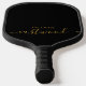 A modern minimalist monogrammed pickleball paddle design featuring a black script and sans serif typography, on a white background.