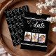 Black and White Modern Photo Collage Save the Date. Announce your upcoming nuptials with this chic and modern save the date card. Featuring a bold black background, this design showcases your 3 favorite engagement photos beautifully. A playful scattering of hand-drawn hearts adds a touch of romance and whimsical design, while the elegant typography clearly states 'Save the Date' and includes space for the couple's names and wedding date. This is the perfect way to inform your guests and build anticipation for your special day, setting a sophisticated tone for your wedding stationery suite. Ensure your loved ones mark their calendars for your unforgettable celebration.