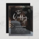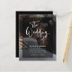 These modern, elegant budget wedding invitations feature your own personal photo covering the background completely. A sheer black overlay contains white trendy script typography, and the back of the card is black. A glam, stylish look your guests will love!