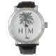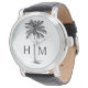 This modern coastal inspired watch features a black palm palmetto tree with a monogram that you can personalize with your choice of initials.