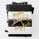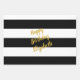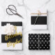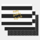One sheet has custom faux gold text on a black and white striped background. Another sheet is black and white stripes without the text. The last sheet has a black and white polka dot pattern.