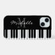 Black and white piano keys monogram iPhone 15 case. Classy monogrammed design for pianist, piano player, music teacher, instructor etc. Keyboard design with personalized name template. Budget friends cover to protect your precious phone.
