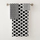 Bath towel set polka dot design. You can customise this black and white bathroom towel set with any text of your choice. Should you require any help with customising then contact us through the link on this page. Black and white polka dot design bathroom towel set