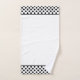A modern white bathroom towel set with a stylish black and white polka dot trim.