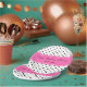 Black and white polka dots with hot pink birthday paper plates. Black polka dot on a white background and a hot pink band with your birthday text.