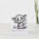 The simplest black and white Christmas note card featuring a raccoon holding a sign with red Merry Christmas, and text