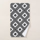 This bath towel set features a contemporary retro abstract pattern of nested black and white diamond squares.