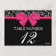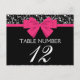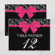 This wedding table number card features an elegant black and white rose pattern, a hot pink bow and white text on a black background. It is printed on both sides.