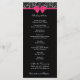 This formal wedding program features an elegant black and white rose pattern, a hot pink bow and white text on a black background.