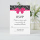 This formal wedding response card features an elegant black and white rose pattern, a hot pink bow and black text on a white background.