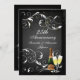 Elegant personalized anniversary party invitation for 25th or any year. Beautiful and festive invites feature black and white design with elegant swirling pattern and two glasses of bubbly champagne with green tinted bottle of champagne to celebrate the guests of honour's big day. Black and silver background with black and white swirls
