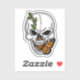 White, orange and black digital art skull with a monarch butterfly and weeds growing out of its eyes and mouth sockets.