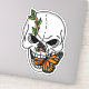 White, orange and black digital art skull with a monarch butterfly and weeds growing out of its eyes and mouth sockets.