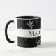 Black with soft faded silver swirls and white snowflakes with a white bordered centre band where your name or monogram fits.