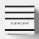 Designer wedding favour guest box in a bold black and white stripe print, the colours can be changed to any colour to coordinate with your special event theme. Text on front, back, and top can be personalized to any message.