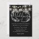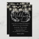 A black and white wedding invitation featuring pretty string lights and a delicate hand-drawn rustic floral garland of botanical leaf foliage with stylish script typography. Personalize with your special wedding day information. Designed by Thisisnotme©