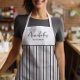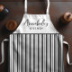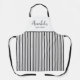 A simple, modern, personalized apron. This design has black and white vertical stripes with a stylish script text template for your name and classic style small type below for your location.