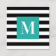 FRONT - Black and white stripe pattern with a customizable bright turquoise single letter monogram. Customize the background colour of the pattern image or the square shape colour. White stripes. Striped pattern.